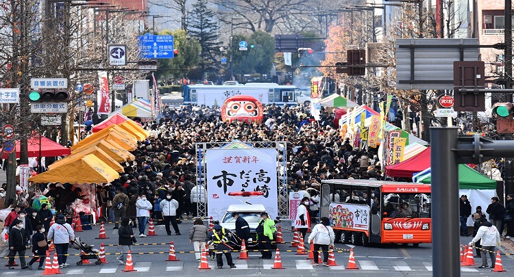 全国で最も早い「高崎だるま市」。1月1日と2日の両日、福を求め大勢の人で賑わいます(高崎市提供)。