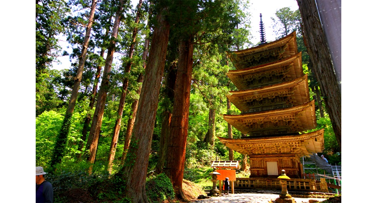 国宝・羽黒山五重塔は、羽黒山の参道である2,446段の石段の途中、杉木立の中にそびえています(鶴岡市提供)。