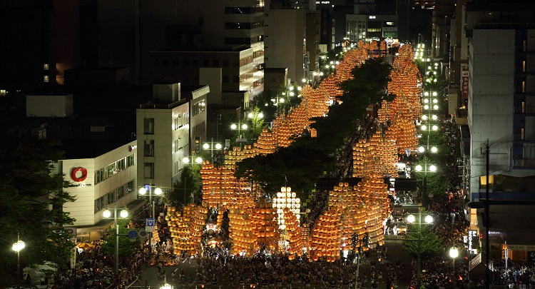 秋田の夏を彩る竿燈まつり。光の稲穂が夜空を埋め尽くし、迫力の妙技が観客を魅了します(秋田市提供)。
