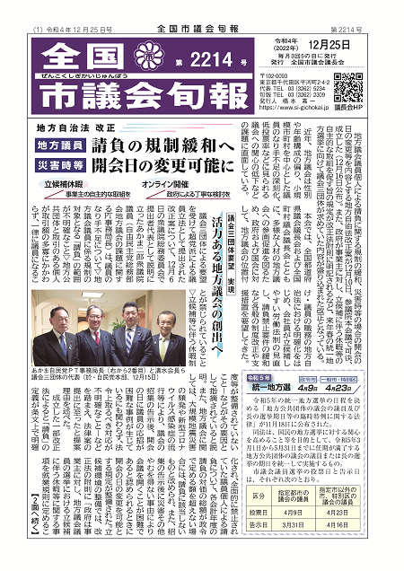 令和4年12月25日(日)、全国市議会旬報第2214号(12月25日号)を発行します。