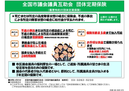 令和8年3月13日全国市議会議員互助会 団体定期保険のご案内について