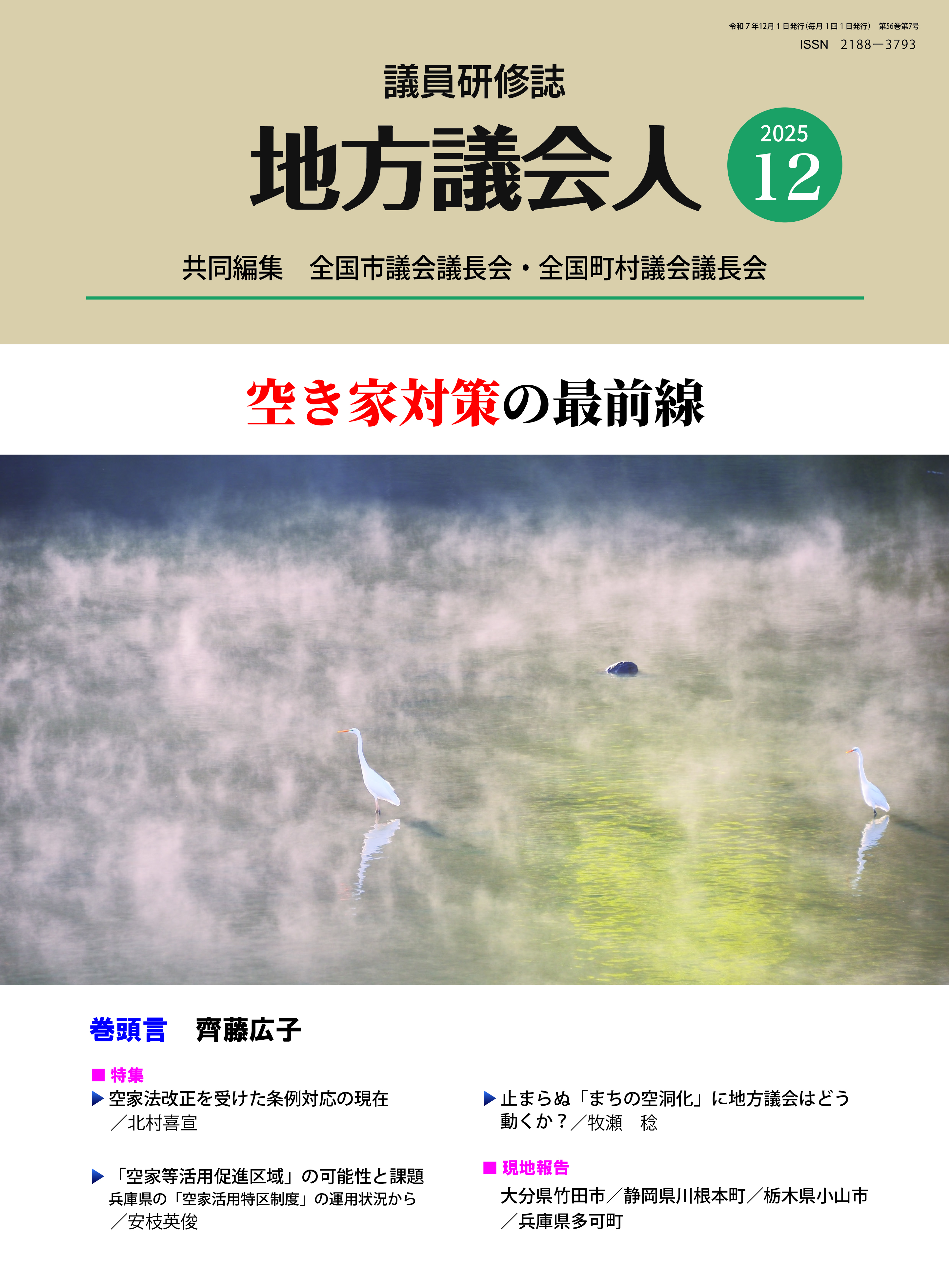 本会と全国町村議会議長会が共同編集している、地方議会議員のための専門研修誌である月刊「地方議会人」の12月号が発売されました。特集は「空き家対策の最前線」です。